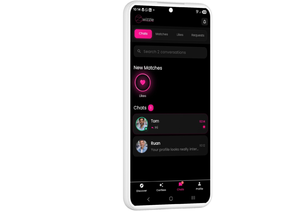 See all your matches and chats in the Zwizzle inbox.