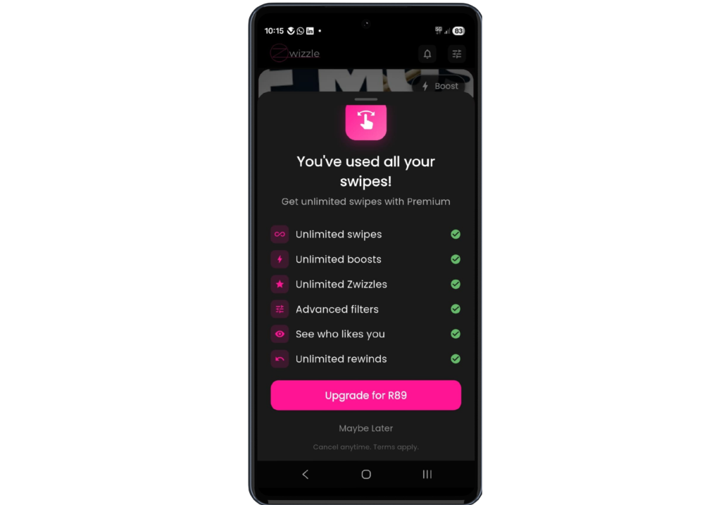 Upgrade to Premium at any stage for unlimited swipes, boosts, and Zwizzle requests.